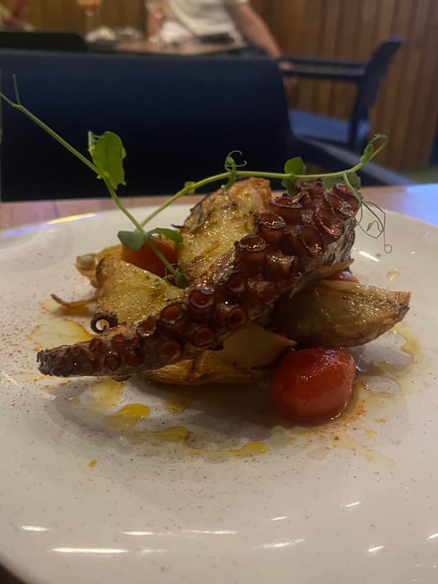 8,5/10El lugar es más bonito de lo que se ve en las fotos, el personal muy amable y la comida fresca y sabrosa. En nuestro caso pedimos pulpo (muy bueno y buena ración, y las papas que acompañaban muy buenas) y entraña (que era sabrosa pero no nos gustó la textura, creo que este tipo de carne es así, algo dura y difícil de masticar, no la habíamos probado antes) El vino en copa también estaba bueno.